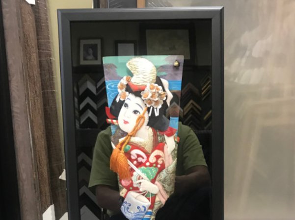We specialize in stretching paintings with staples on the back or putting black tape around the sides after stretching. Cross-stitch and embroidery stuffing needlework, silk and materials. Shadow boxes for sports jersey or collectibles. Fast service for shrink wrap for watercolor and matting.